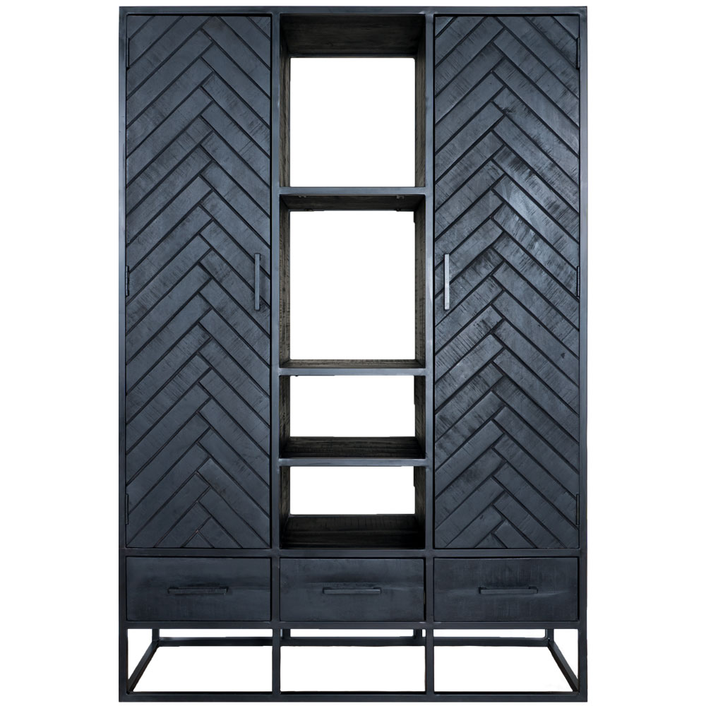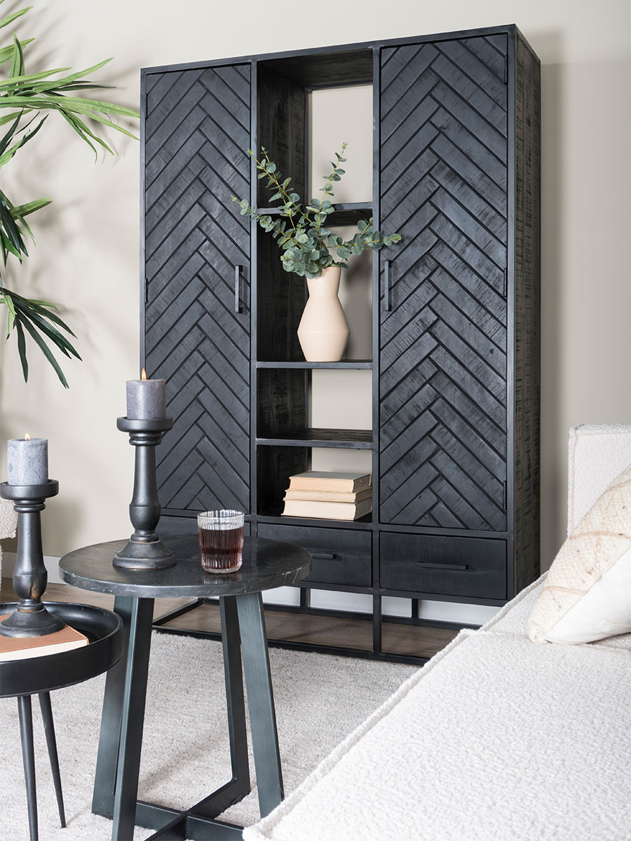 Opbergkasten - Opbergkasten met visgraatmotief, kasten met open vakken en dichte deurtjes en zwarte metalen vitrinekasten