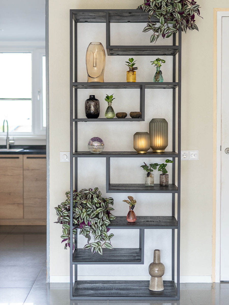 Je kunt een open kast op verschillende manieren inrichten. Ben je gek op mooie accessoires? Zet ze niet in een dichte kast maar geef ze een mooi plekje in een vakkenkast!