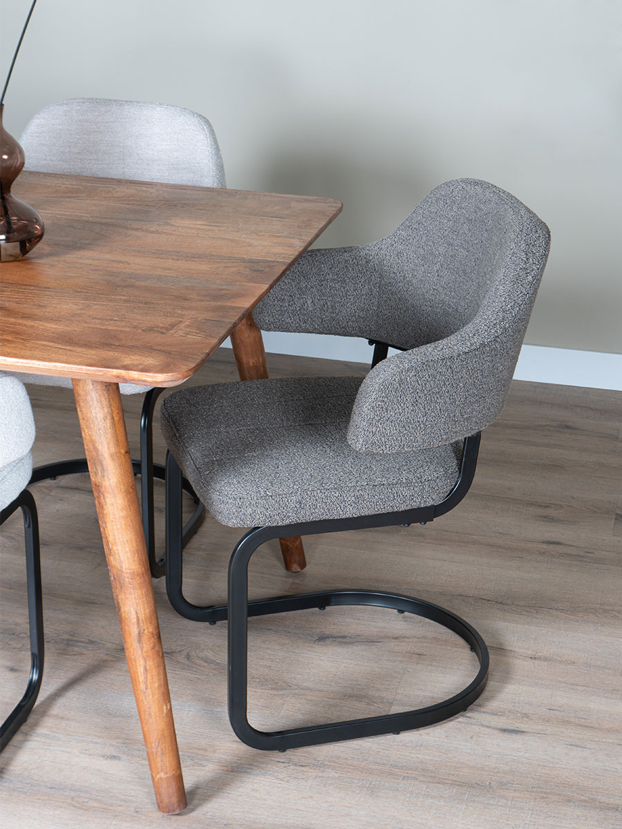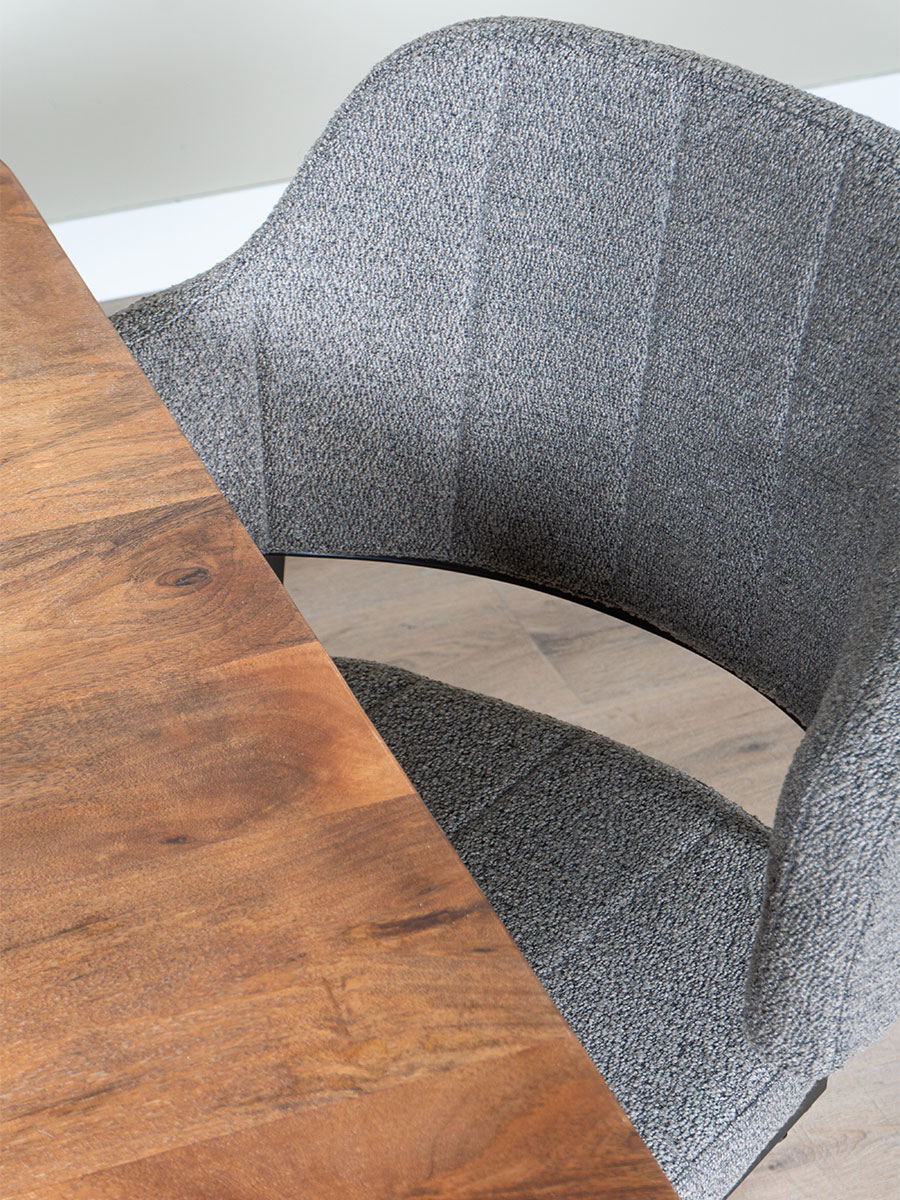 Dankzij de boucle stof die niet alleen zacht aanvoelt, maar ook een chique uitstraling heeft en het metalen onderstel geeft de stoel een eigentijdse twist aan je interieur.