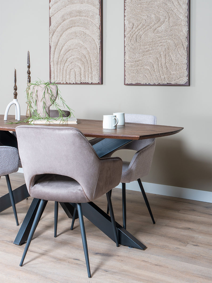 Deze rechthoekige schoonheid met afgeronde hoeken straalt een tijdloze elegantie uit. Het tafelblad, 3 cm dik en conisch aflopend, is vervaardigd uit prachtig mangohout in een espresso kleur. Ondersteund door een robuuste metalen spinpoot, staat eettafel Felix voor duurzaamheid en stijl.