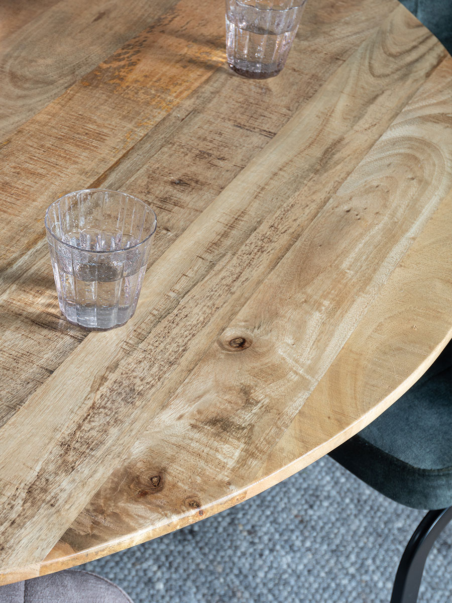 Ontdek onze ronde Eettafel Icon van Mangohout. Deze prachtige tafel is vervaardigd uit duurzaam mangohout en heeft een uniek conisch aflopend blad. Het hout straalt warmte en karakter uit, terwijl het ronde ontwerp een gezellige sfeer creëert voor elke eetkamer.
