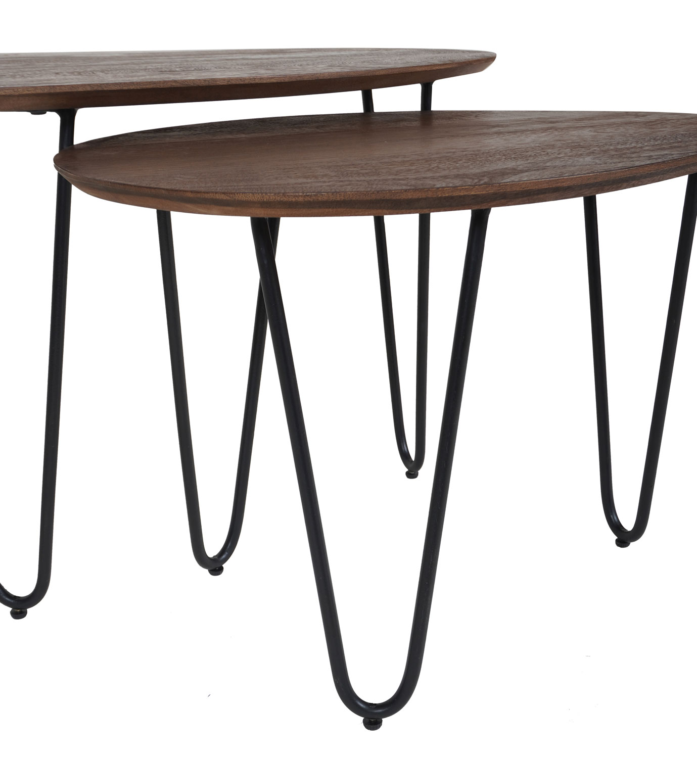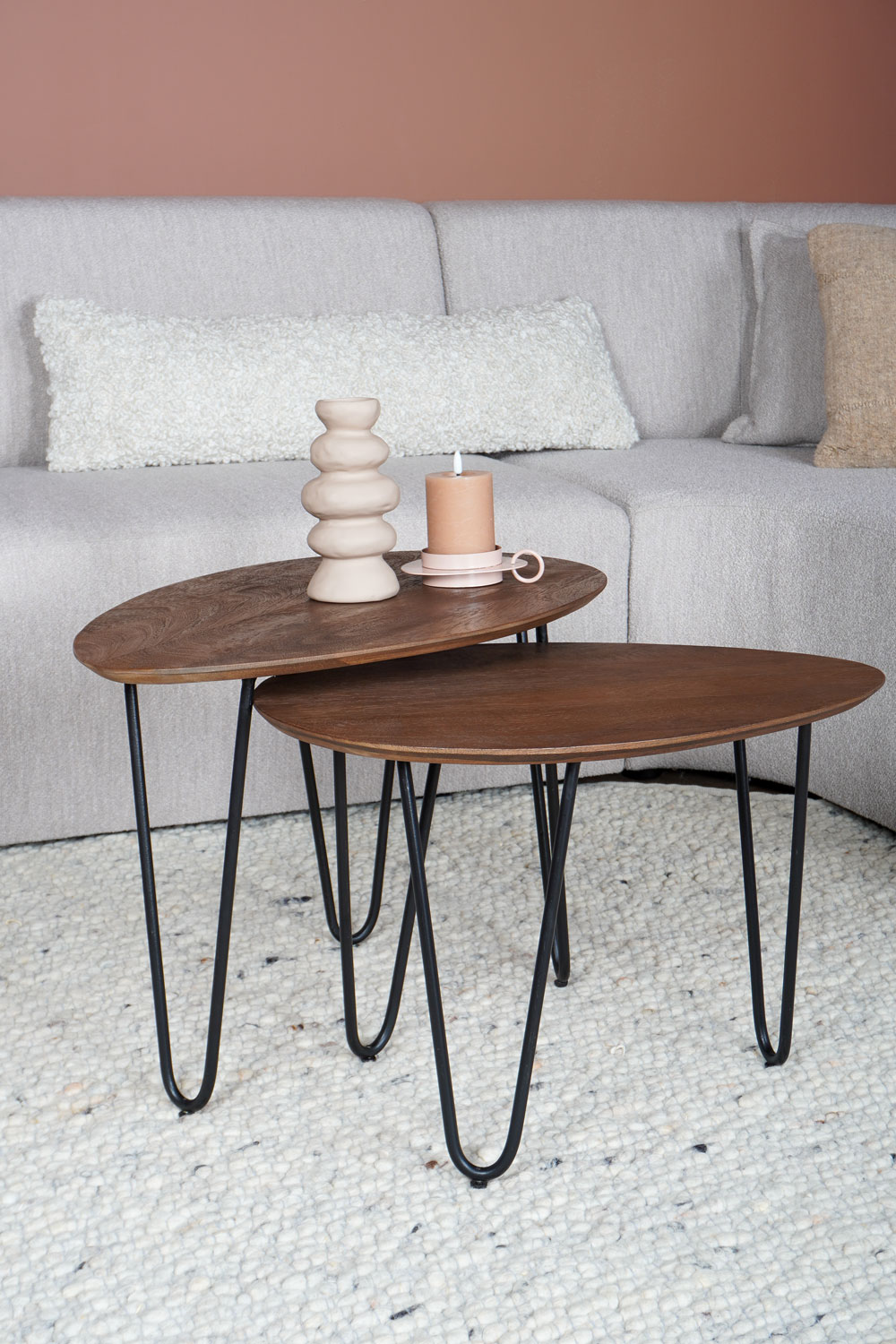 Fabio bestaat uit twee organisch gevormde tafels. Onder de grotere tafel van 68 x 43 x 44 cm schuif je eenvoudig de kleinere tafel van 60 x 42 x 40 cm. Zo bepaal je helemaal zelf hoe je de tafels neerzet. De tafelbladen zijn uitgevoerd in natuurlijk espresso mangohout. De drie speelse hairpin poten in zwart geven de tafels een fris en luchtig karakter.