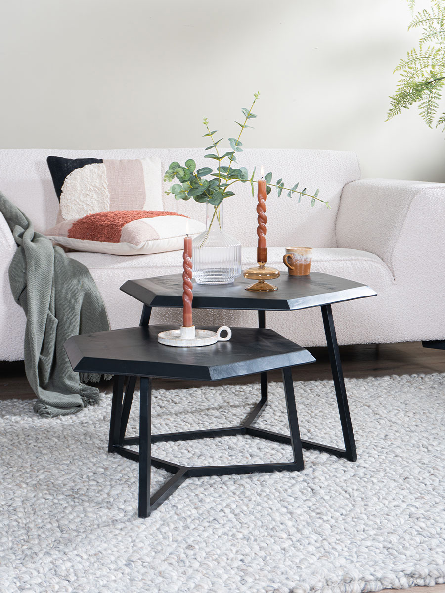 Salontafel Kiara is een set van 2 tafels. De combinatie van een slanke metalen frame en zeshoekige mangohouten blad, geeft deze salontafel set van 2 een speelse en stoere look. De twee tafels, van de bijzettafel set van 2 zwart, verschillen in hoogte, hierdoor kunnen ze gemakkelijk onder elkaar geschoven worden!