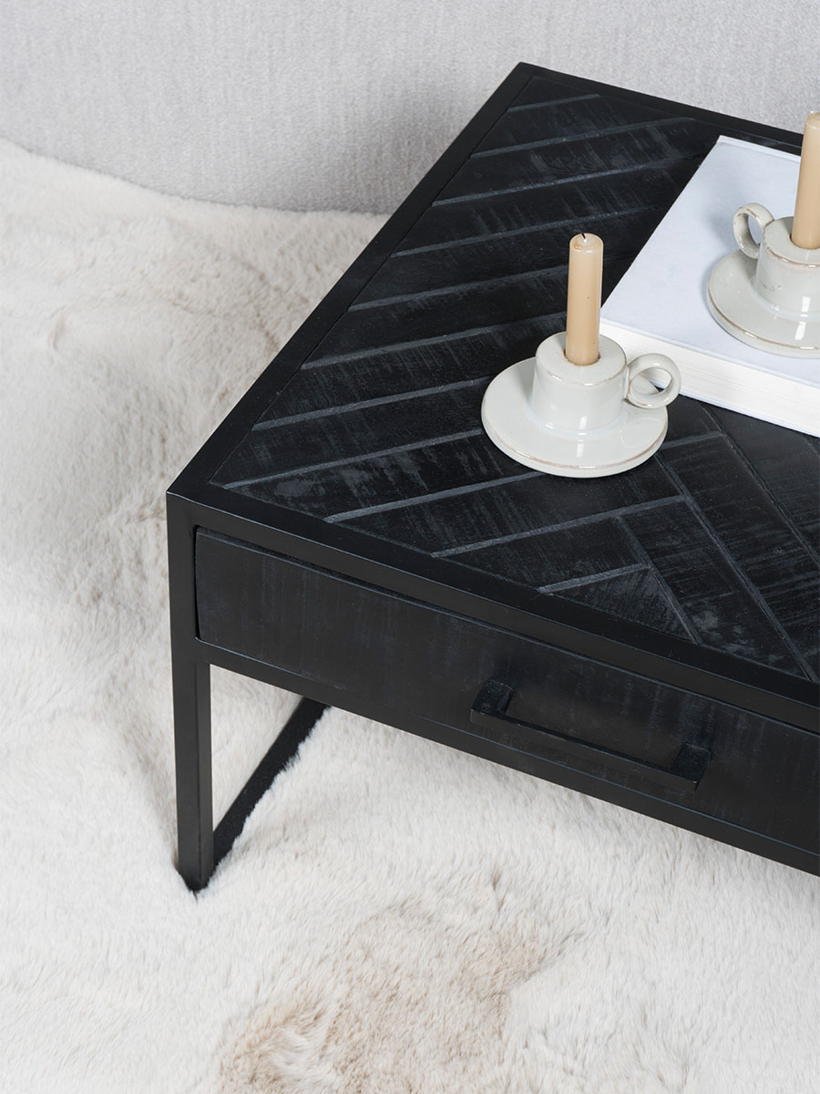 Salontafel Ruby is een vierkante salontafelset van 2. De tafelset is gemaakt van metaal en massief mangohout met een prachtig visgraat motief.