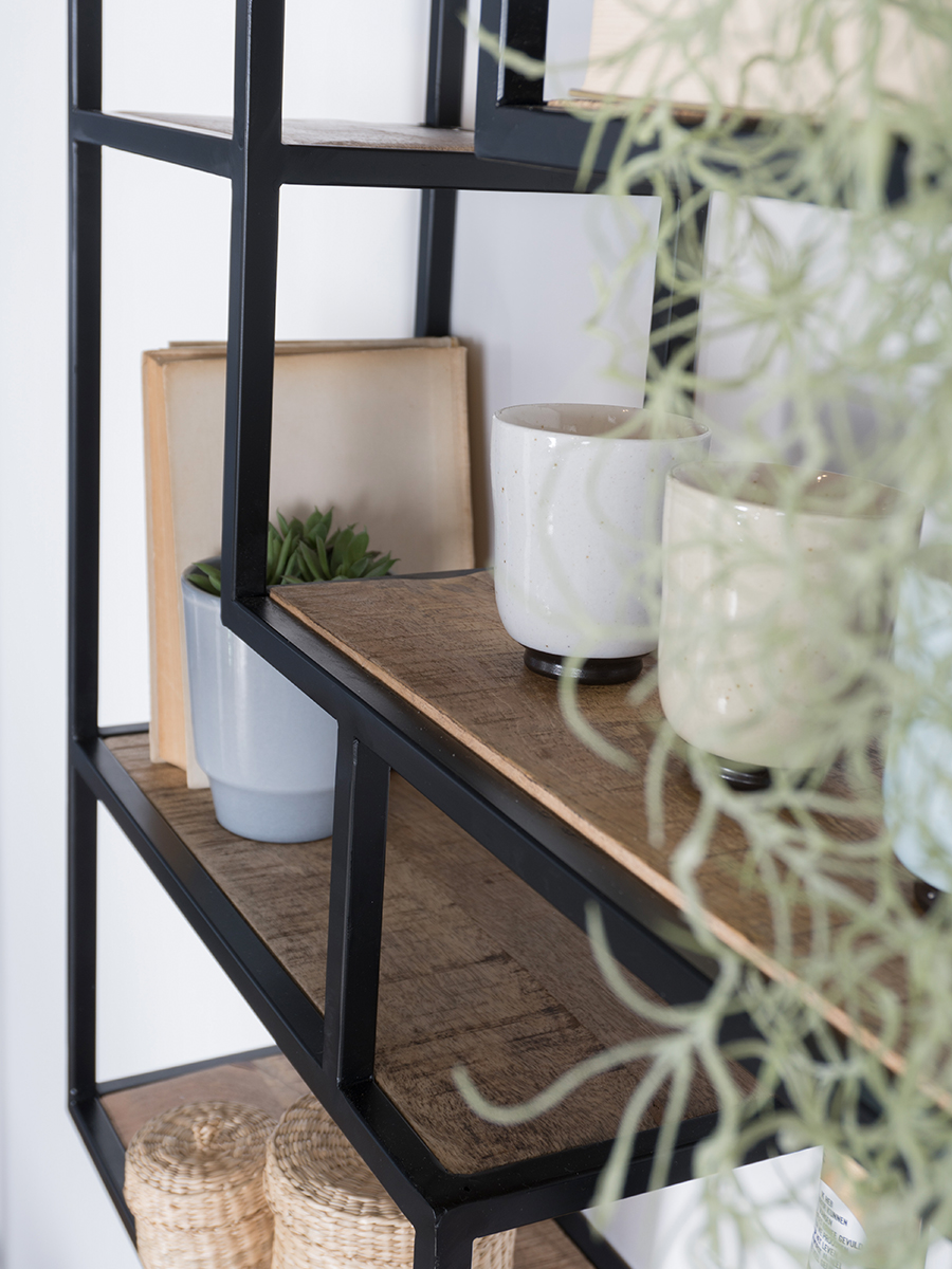 Het rek bestaat uit 6 verschillende vakken en het metalen frame in combinatie met de mangohouten planken geeft een stoere, industriële look. Perfect om te decoreren met verschillende soorten accessoires zoals planten, kaarsen en fotolijstjes. Huub is ideaal om je mooiste spulletjes uit te stallen, maar bijvoorbeeld ook erg handig in de keuken voor verschillende specerijen en kruiden.